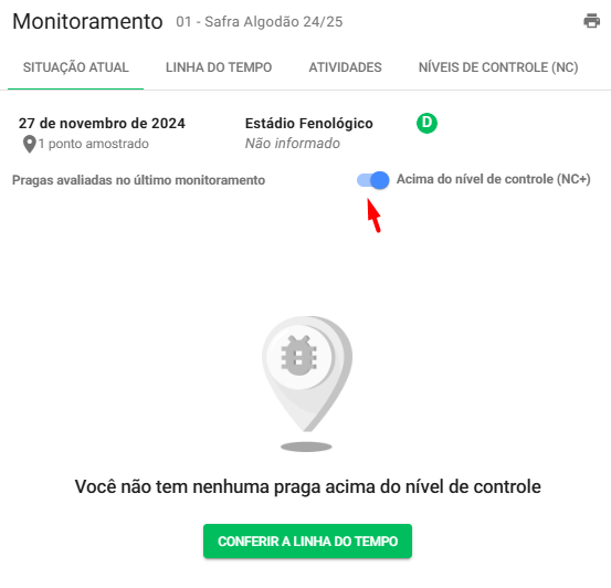 Nessa aba você encontra os monitoramentos dispostos de forma temporal, onde cada nova coluna é a data de um monitoramento. Há uma lista onde você pode observar cada praga com a informação do nível de controle e datas dos monitoramentos na lavoura.