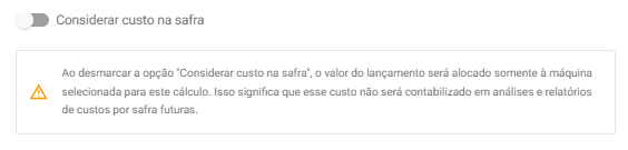 Ao desmarcar o seletor, o custo não será atribuído a nenhuma safra, fazendo com que o custo somente vá para a máquina e para nenhum lugar a mais.