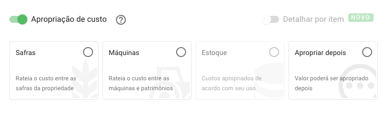 Ao manter o seletor ativado, você terá disponível as seguintes formas de apropriação de custo: