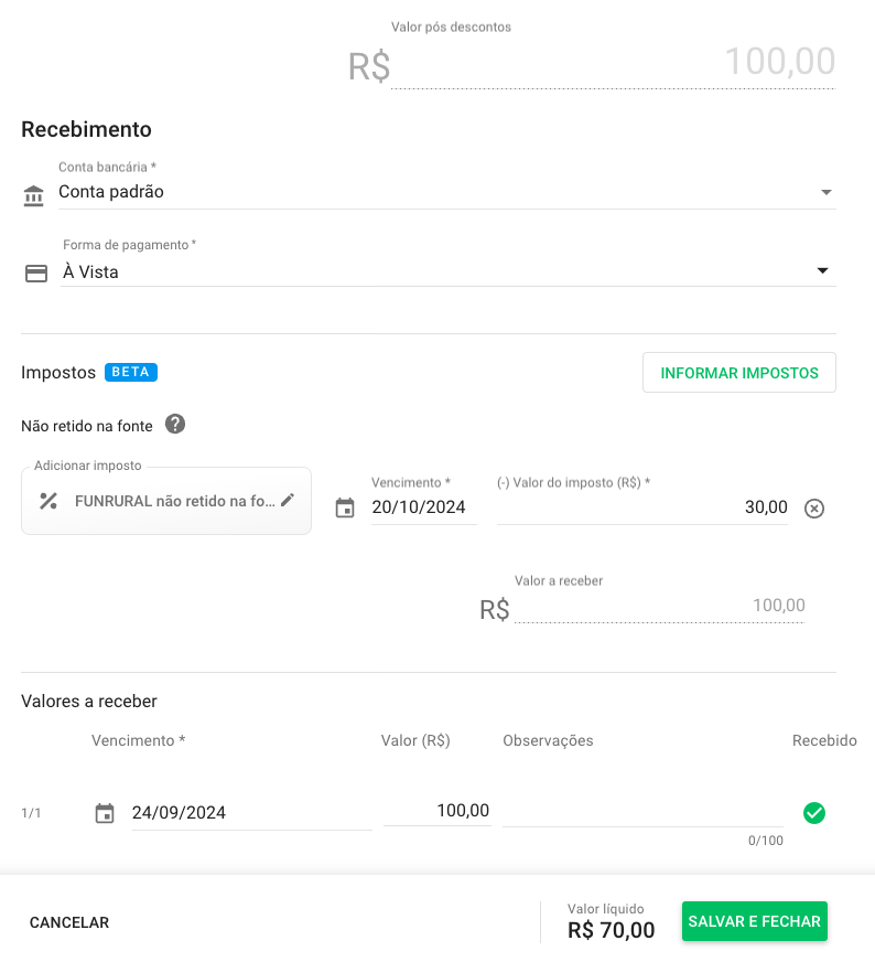O valor lÃquido é igual ao total dos valores a receber, menos o total dos impostos.