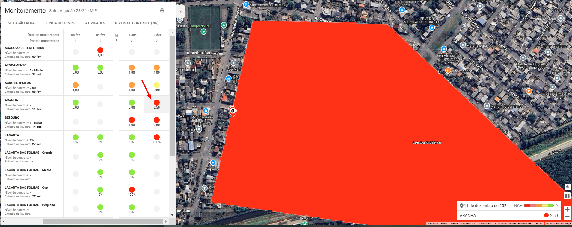 Importante destacar que o índice que aparece na Linha do Tempo referente a praga amostrada é um produto das amostragens coletadas durante o monitoramento, dividida pela quantidade de amostragens realizadas.